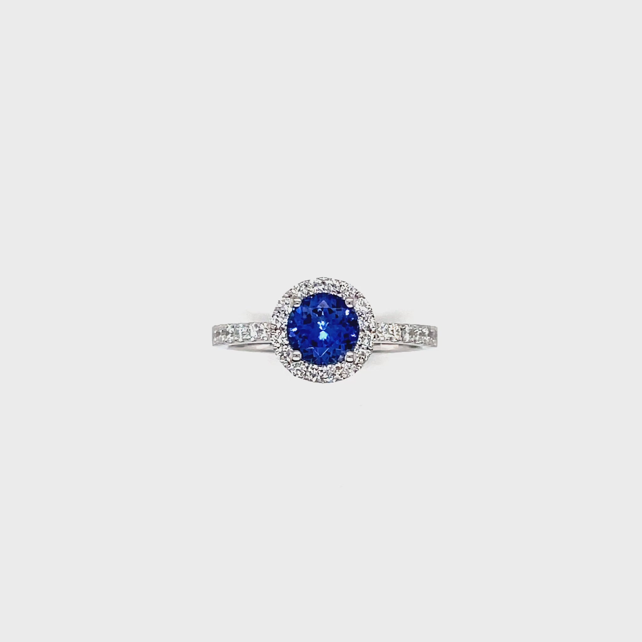 Tento výjimečný zásnubní prsten zdobí okouzlující tanzanit v sytě modrofialovém odstínu, obklopený zářivou aurou třpytivých diamantů. Propracovaný design obroučky dodává šperku jemnou eleganci, díky níž se stává dokonalým symbolem lásky a oddanosti. Ideální volba pro ty, kteří si cení jedinečných a výrazných drahokamů.